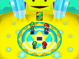 Diesmal spielt es keine Rolle, was geantwortet wird. Nachdem zum dritten Mal geantwortet wurde, stellt sich heraus, dass die richtige Antwort lautet "Alle zusammen". Danach behauptet das Tor zum Sternenschrein, dass Luigi lügt und Luigi weint. Mario erzählt dem Sternentor alles, außerdem schlägt Baby Mario es mit seinem Hammer.