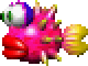 Der Dumgug stellt einen an einen pinken Cheep-Cheep erinnernden Fisch mit gelben Stacheln, einer gelben Schwanzflosse, dicken, roten Lippen und großen Augen mit grünen Pupillen und violetter Umrandung über den Augen dar.
