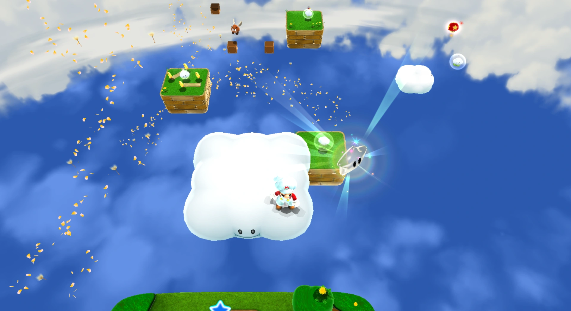 Ein Planet aus mehreren kleinen Bereichen mit Blumen, Büschen und Wolken, die sich mit der Wolkenblume überqueren lassen. Über einer Wolkenplattform gibt es einen Max. Kraft-Pilz und eine ?-Münze lässt Münzen erscheinen. Eine große Windmühle erzeugt Wind, den Wolken-Mario benutzen muss, um drei Trommeln zu erreichen. Über die Trommeln kann er auf ein Becken mit einem Sternenring springen.