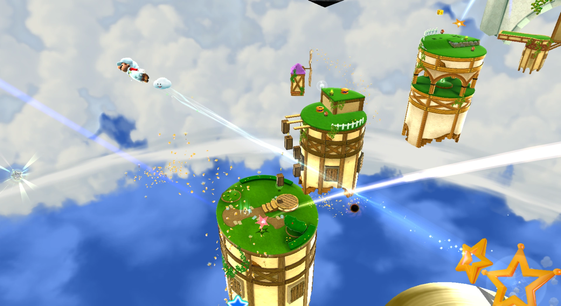 Auf dem ersten Turm gibt es eine Wolkenblume, eine Rücksetzfahne und einen Gourmet-Luma. Dieser verlangt 30 Münzen. Wolken-Mario kann eine Öffnung betreten, um von einer Wolke nach oben gebracht zu werden, wobei er aber Hindernissen aus Holz ausweichen muss, um nicht wieder runterzufallen. Oben begegnet er einen Gumba und einem Oktumbala. Außerdem gibt es einen Teleporter, Trampoline und einen riesigen Ventilator, mit dessen Wind der nächste Planet erreicht werden kann. Auf dem Turm dieses Planeten gibt es zwei Gumbas, einen Oktumbala, einen ?-Block und einen Sternenring. Zudem kann in der Mitte ein geheimer Bereich mit einem 1-Up-Pilz und einer Wolkenblume gefunden werden.