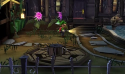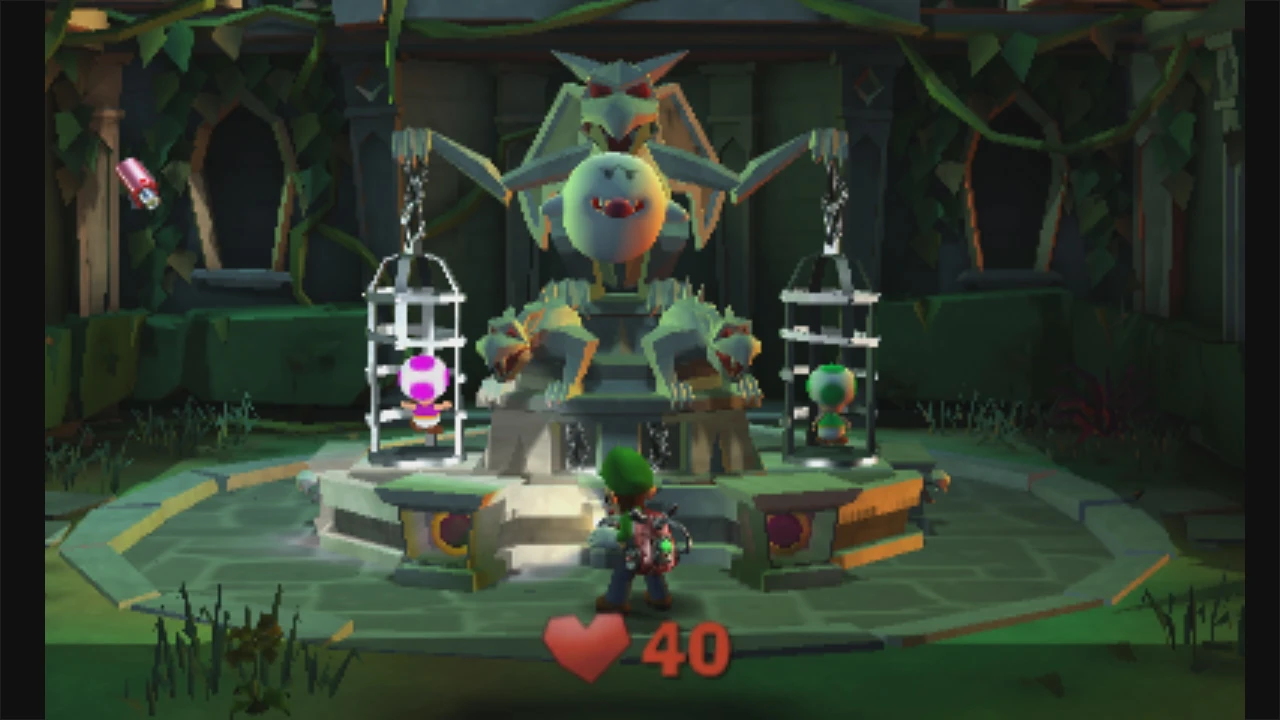 In diese Mitte befindet sich eine große Statue die zwei kleinere Statuen mit Käfigen in den Händen und an den Seiten befinden sich viele Pflanzen, außerdem ist der Raum sehr überwuchert mit Pflanzen. Wenn man die zwei Toads in die Käfige wirft, dann schiebt sich die Statue nach hinten und aus dem Boden kommt eine riesige Wendeltreppe heraus.