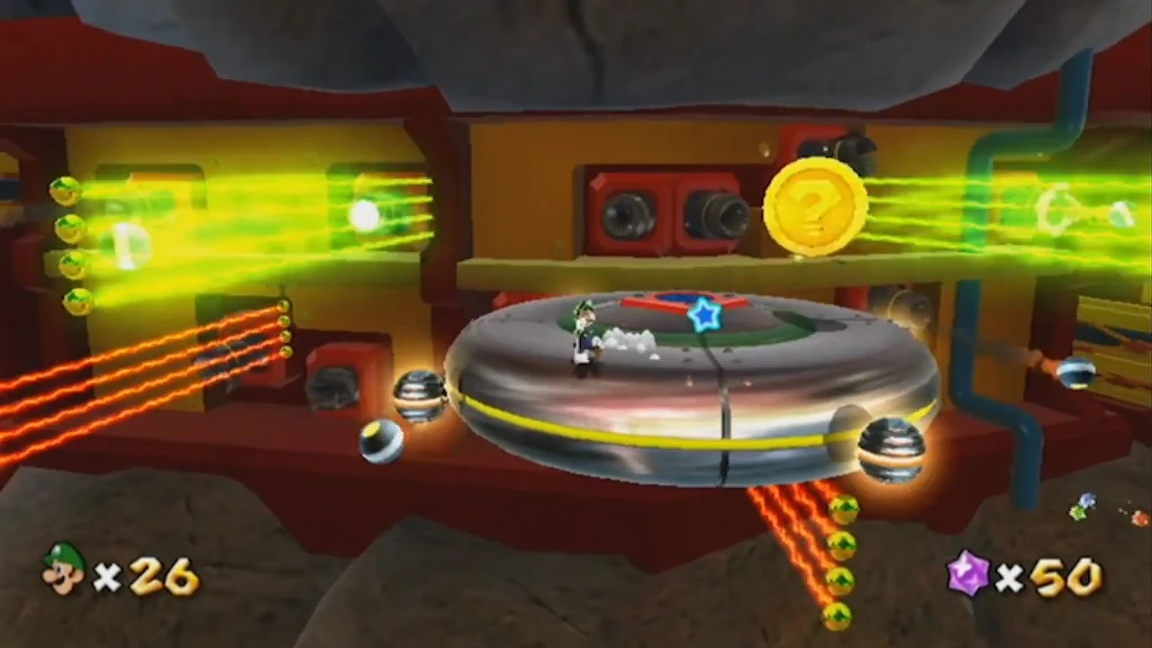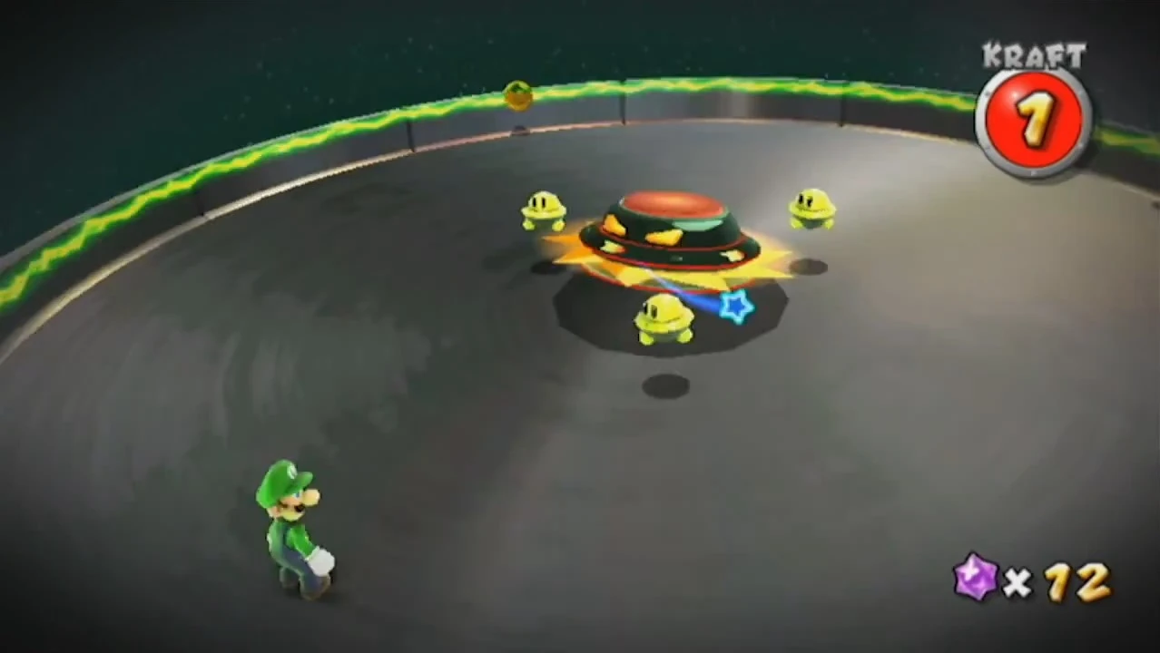 Allerdings muss er den Sparkys ausweichen, wenn er nach unten läuft, um den feindlichen Geschossen zu entgehen. Kugelwillis sind hier nicht das einzige Problem. Zäune und Energiebarrieren säumen die Flugbahn der Scheibe. Mario muss zwischen Oberseite und Unterseite der Scheibe wechseln, um den Hindernissen auszuweichen. Eine Serie von Münzen deutet an, dass die Zeit für den ersten Seitenwechsel gekommen ist, danach gibt es leider keine derartigen Hinweise mehr. Eigentlich muss Mario sogar am Rand der Scheibe stehen, um zwei Hindernissen gleichzeitig auszuweichen. Mario muss dabei auf die Kugeln achten. Wenn Mario die ?-Münze auf dem Weg berührt, kommen aus zwei Kanonen Sternenteile heraus. Mario muss sie mit dem Zeiger sammeln. Die kleinen Elektrobarrieren kann Mario einfach überspringen. Nach einer Weile erreicht die Scheibe zwei große, stationäre Scheiben. Direkt vor Mario befindet sich der Power-Stern, aber er ist in einem Käfig eingesperrt. Mario muss diesen Käfig irgendwie aufbrechen – wie praktisch, dass zwei Kugelwilli-Kanonen im Hintergrund aus der Wand ragen. Wenn du einen Kugelwilli anlockst, folgt er Mario über die zweite Scheibe und befreit den Power-Stern. Vier Käfige sind auf der Oberfläche der oberen Scheibe installiert. Sie enthalten Münzen, Sternenteile und eine Sprungfeder. Einige dieser Käfige müssen gesprengt werden, damit Mario einen der Kugelwillis auf die Nachbarplattform locken kann. Lauf zum hinteren Teil der Plattform, um einen Kugelwilli anzulocken, und spring dann hinter den Käfig, der zerstört werden soll. Die Sprungfeder schleudert Mario unter einen ?-Block voller Sternenteile. Auf der Unterseite der hinteren Plattform steckt ein 1-Up-Pilz in einem Käfig. Am Außenrand kann Mario einen Kugelwilli aus der hinteren Kanone anlocken und zum Käfig führen. Wenn der Weg freigeräumt ist, kann Mario einen Kugelwilli anlocken und zu vorderen Scheibe leiten. Führe ihn direkt zum Käfig und spring dann kurz vor dem Aufprall drüber. Der Käfig fliegt auseinander und der Power-Stern ist frei. Mario muss sich den Stern nur noch schnappen und zur Sternwarte zurückkehren.