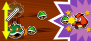 Bowser rollt sich in seinen Panzer ein und muss einen Koopa, der ebenfalls in seinem Panzer steckt, in Richtung Gegner schleudern. Recht bald kommen jedoch mehr Koopas hinzu, sodass Bowser sich um bis zu drei gleichzeitig kümmern muss. Man führt Bowser mit dem Touchpen und muss so die Koopas treffen. Die Attacke trifft per Zufall alle am Boden befindlichen Gegner.