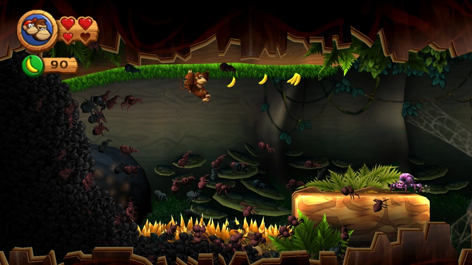 Zu Beginn des Levels wird auf zahlreiche mit roten Eiern gefüllte Spinnenwebensäcke gestoßen, die sich noch als Plattform nutzen lassen. Kurz dahinter versperren zwei Holzplatten den Weg und müssen folglich zerstört werden, was jedoch auch einige Mampfer-Eier zerstört, woraufhin in Windeseile die gesamte Ladung an Eiern aufbricht und die Mampfer entlässt. Diese formen sich zu einem unbeschreiblich riesigen Schwarm und beginnen die Kongs zu verfolgen. Auf der Flucht vor den Mampfern werden weitere ihrer Eier angetroffen und viele der Mampfer schießen aus den Abgründen heraus.
