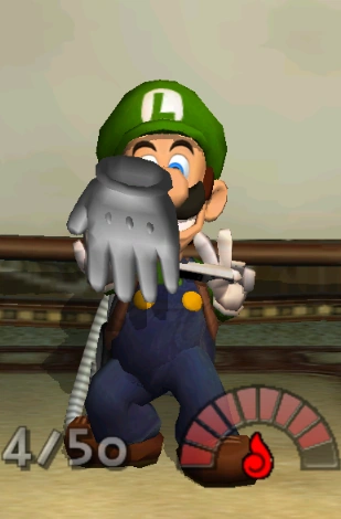 Als Luigi Madame le Caro den Handschuh zeigt, sagt sie: "Wa-Was ist denn das? Sieh an, Marios Handschuh! Ah-hah! Er ist noch immer feucht vom Angstschweiß!"