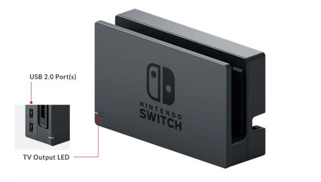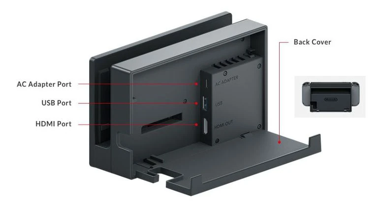 Anders als bei der Wii U verfügt der stationäre Teil nicht über die ganze Hardware. Bei der Nintendo Switch befinden sich hier nur die Strom- und TV-Anschlüsse.