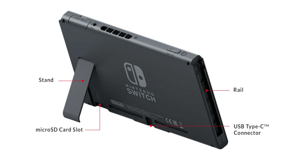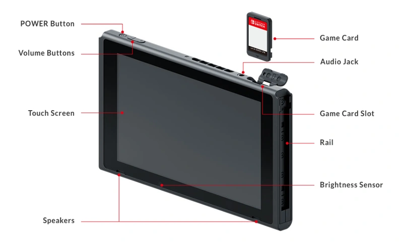 Auf der Vorderseite befinden sich außer des Touchscreens keine weiteren Bedienelemente, diese werden allein von den Joy-Cons geboten. Auf der Oberseite des Tablets befinden sich neben Powerschalter, Lautstärkeregler und Kopfhörereingang auch das Einschubfach für die Cartridges, welches zusätzlich von einer entfernbaren Blende geschützt wird, und der Warmluftauslass des Lüfters. An den beiden Seiten des Tablets befinden sich Schienen, die als Halterung für die Joy-Cons dienen. Auf der Unterseite befinden sich ein Helligkeitssensor, die beiden Stereo-Lautsprecher sowie der Ladeeingang für Station oder Ladekabel. Auf der Rückseite befinden sich neben dem weißen Switch-Logo ein ausklappbarer Standfuß, hinter dem sich ein Slot für MicroSD-, MicroSDHC- oder MicroSDXC-Speicherkarten verbirgt.
