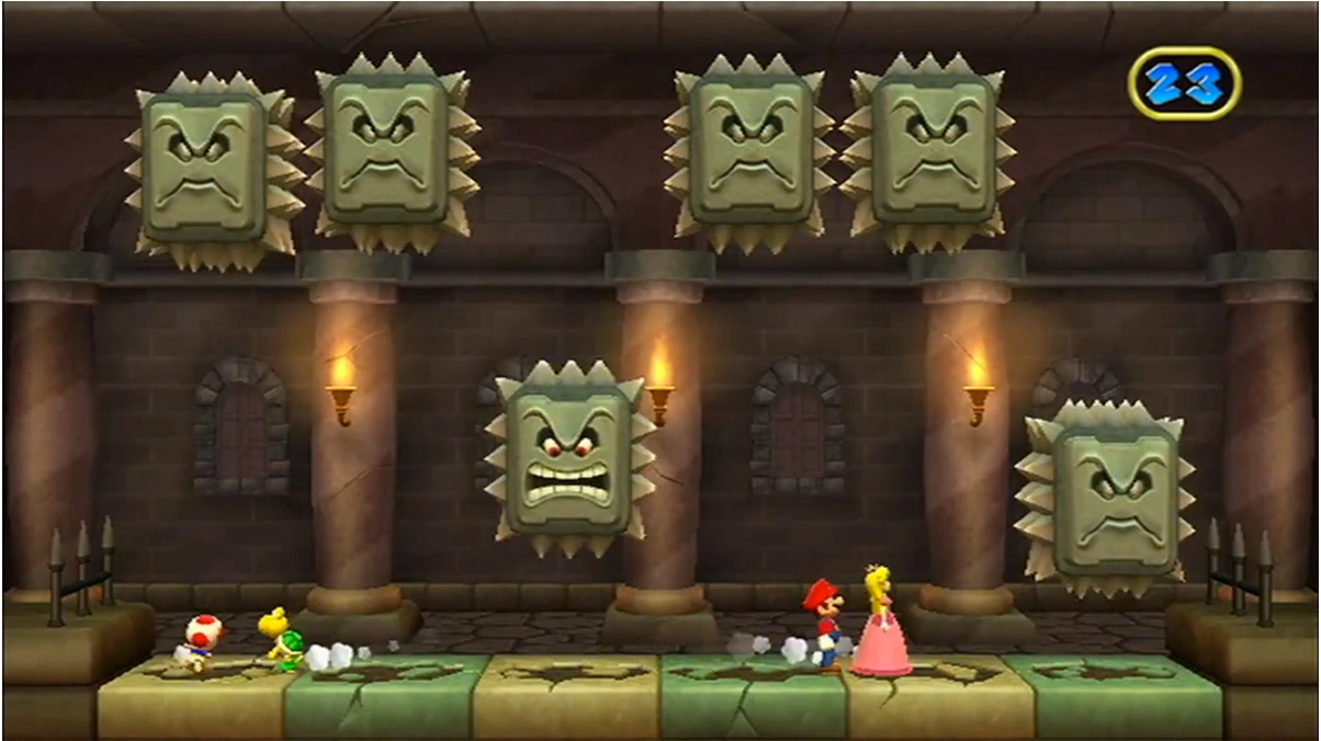 Es gibt auch eine Verkehrte Welt-Variante von diesem Minispiel, bei der es gilt, als Erster von einem Steinblock getroffen zu werden, um zu verlieren und damit zehn Ministerne zu erhalten.
