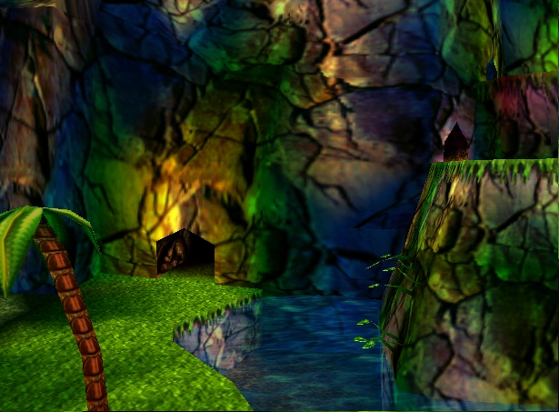 Werden in der Starthöhle die beiden Zielschalter betätigt, öffnet sich ein Tor zu einem neuen Raum, in dem die Goldene Banane wartet. | |
