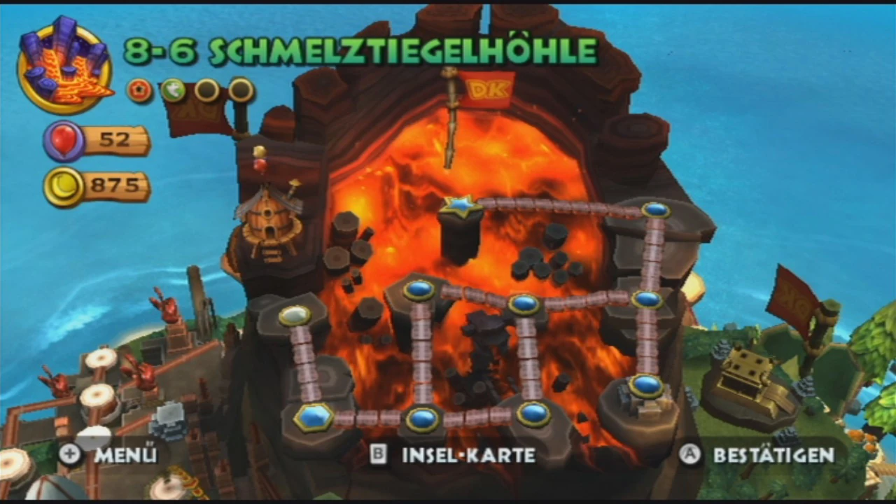 Fünf-Affen-Prüfungen | Dieses Level wurde in fünf Teile mit jeweils eigenen Hindernissen und Gegnern aufgeteilt. Um es freizuschalten, müssen in den vorherigen Leveln im Vulkan alle K-O-N-G Buchstaben gesammelt werden. |