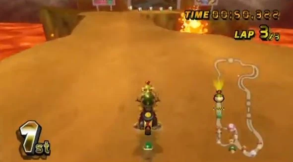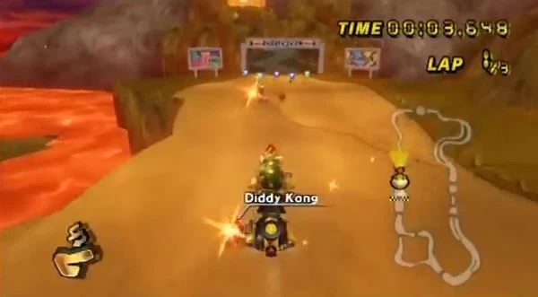 1. Es gibt auf dieser Strecke eine Abkürzung, mit der man in weniger als einer halben Minute die Strecke fahren kann. Wenn man sich auf der Startlinie links wendet, sieht man einen Berg, auf dem man im Kreis fahren kann. Mit manuellem Driftmodus und einem Pilz kommt man auf den Berg und wenn man im Kreis um ihn fährt, wird das als Runde gezählt. Dazu muss man einen leichten Fahrer mit Bike wählen.