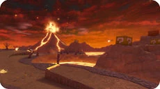 Zunächst führt es in den Vulkan und somit in eine Höhle. In der Höhle gibt es zwei Wege, die jedoch nur nebeneinander (bzw. der eine Weg dient als "Mauer" des anderen Weges) liegen. Anschließend muss man über mehrere bewegende Plattformen fahren und kommt in ein Areal indem viele Gesteinsbrocken und Feuerbälle auf einen fallen können. Dieses Areal erstreckt sich zunächst über zwei große Kurven, wobei jede Kurve, wie in der Höhle, zwei nebeneinander liegende Wege hat. Der obere Weg ist immer der äußere Weg mit einem Beschleunigungsstreifen. Anschließend trennt sich der Weg und es führt um einen kleineren Vulkan. Das Ziel ist nach dieser Passage erreicht.