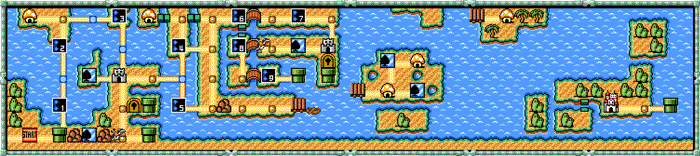 In den Wasser-Leveln dieser Welt empfiehlt es sich, den neuartigen Froschanzug auszuprobieren, über dessen Kleidsamkeit sich zwar streiten lässt, der aber im Wasser das Fortkommen ungemein erleichtert. Immerhin sechs der 12 Level spielen an weitgehend trockenen Orten. Das liegt daran, dass über die gesamte Karte zumeist kleine Inseln verteilt sind, die über ein Netz von Brücken und Wegen teilweise miteinander verbunden sind. Zwei dieser Inseln sind nur mit Hilfe eines kleinen Bootes zu erreichen, das an einem Steg vertäut ist. Man kann sie mit Fug und Recht als Bonus-Inseln bezeichnen, denn sie sind mit mehreren Pilzhäusern und Pik-Feldern ausgestattet. Insgesamt gibt es fünf gelbe Pilzhäuser und ebenfalls fünf Pik-Felder in diesem Land. Das weiße Pilzhaus erscheint, wenn Mario in 3-8 mindestens 44 Münzen sammelt. Zudem schlendern zwei Hammerbrüder über die Inseln und es gibt drei Röhrenpaare. Insgesamt kann man 3 Steine zertrümmern, die ersten beiden befinden sich direkt nach dem Start und ermöglichen den Zugang zur ersten Röhre und dienen als Abkürzung, der dritte macht den Weg zu den Bonus-Inseln frei und befindet sich nahe dem fünften Level. Außerdem ist noch darauf hinzuweisen, dass Mario in 3-3 erstmals auf den menschenfressenden Fisch Big Bertha trifft. Sobald der Zauberstab wieder in Händen des Königs ist, kann Mario auch dieses Land als befreit betrachten und sich auf den Weg zum nächsten machen, zum Land der Riesen.