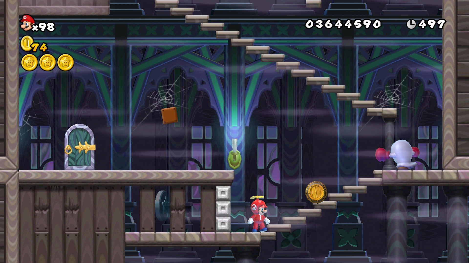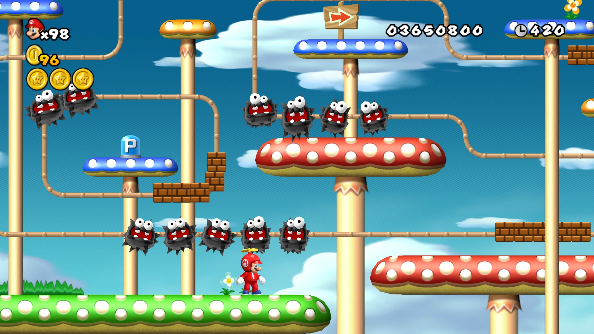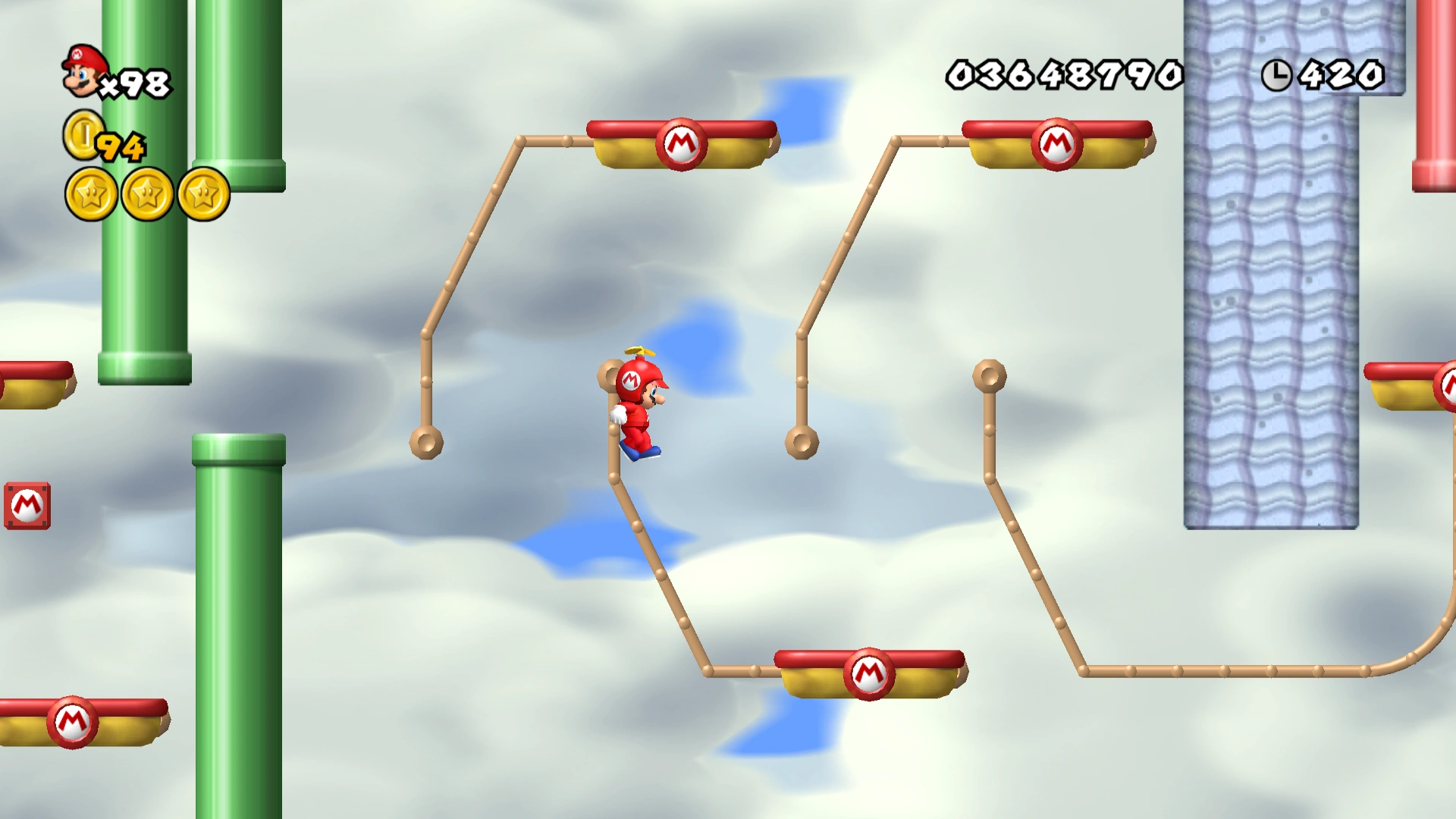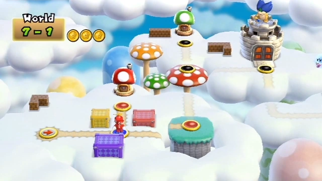 Die Welt 7-1 besteht zum größten Teil aus sich bewegenden bunten Blöcken und Röhren die von einigen Piranha-Pflanzen besiedelt sind. In dem bunten Durcheinander verliert man schnell man den Überblick, weshalb die Propeller-Verwandlung durchaus erstrebenswert ist, um Stürzen zwischen die Platformen zu entgehen.