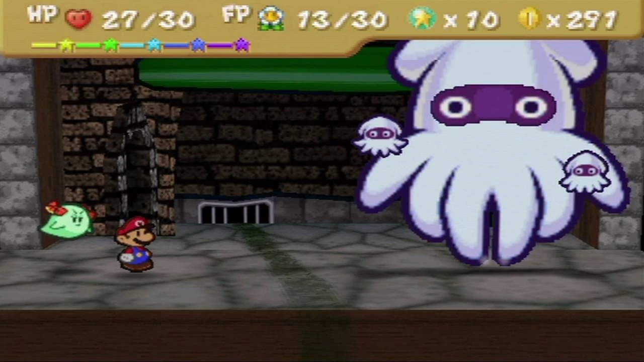 En Paper Mario 64, hay tres Bloopers en las alcantarillas de Pueblo Toad que protegen áreas concretas. Uno de ellos protege una medalla de pisotón encogedor, otro protege las tuberías que llevan a Villa Goomba, a Villa Koopa y al Puerto Seco Seco y el último protege las tuberías que llevan a la aldea de Yoshi, a villa Escalofrío y a la habitación secreta de Rip Cheato y las Ultra botas. El tipo de Blooper que protege la entrada varía dependiendo del número de Bloopers guardianes con los que Mario haya peleado. El primer Blooper contra el que Mario luchará siempre será un Blooper normal, el segundo contra el que peleará será un electro Blooper y el último siempre será el Ultra Blooper.