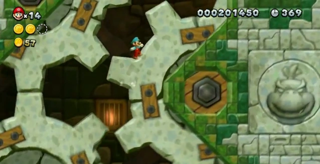 Moneda Estrella 1: La primera Moneda Estrella se encuentra en el segundo mecanismo del juego, en una plataforma móvil que tapa a la moneda, el jugador tendrá que saltar entre los muro para alcanzarlo.