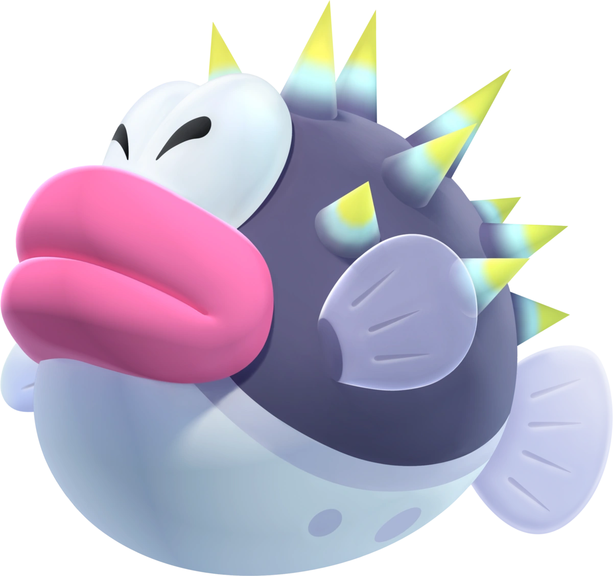 El diseño de estos enemigos está basado en los peces globo de la vida real. Son esféricos y de mayor tamaño al de la mayoría de especies Cheep Cheep. Su tripa de color blanco y el dorso es de un color oscuro. Su espalda está recubierta de pinchos de color azul y amarillo. Tiene dos aletas laterales de color lila y una aleta caudal del mismo color, que usa para impulsarse por el agua y nadar a gran velocidad. Tienen unos grandes labios rosados y dos grandes ojos de color blanco.