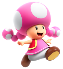 NGC: Mario Kart: Double Dash!! | Una chica por la que beben los vientos muchos Toads. Se diferencia de estos por su cabeza rosa y sus complementos con motivos "champiñosos", que le dan un encanto innegable. Debutó como personaje oculto en Mario Kart: Double Dash!! Con la ayuda del champiñón turbo dorado podía encadenar varios acelerones para dejar atrás a sus rivales. |