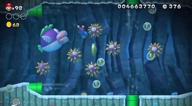 Bien que non disponible en tant qu' élément à placer dans l'éditeur de stage, le Cheep Chomp apparaît dans le background du thème aquatique de New Super Mario Bros U.