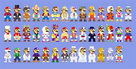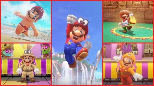 Différents costumes du jeu (ici, de la gauche vers la droite : Mario en caleçon, la tenue habituelle, Mario en tenue de Zuituzèc, Mario explorateur (en référence à Mario's Picross) et Mario constructeur (clin d'œil à Super Mario Maker et son remake sur 3DS).)