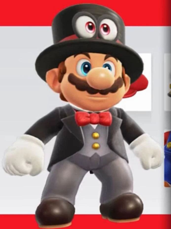 | Haut-de-forme de Mario / Smoking de Mario | Débloqué en atteignant le Pays de la Lune. Peut être débloqué immédiatement avec l'amiibo Mario du jeu. | Pays de la Lune |