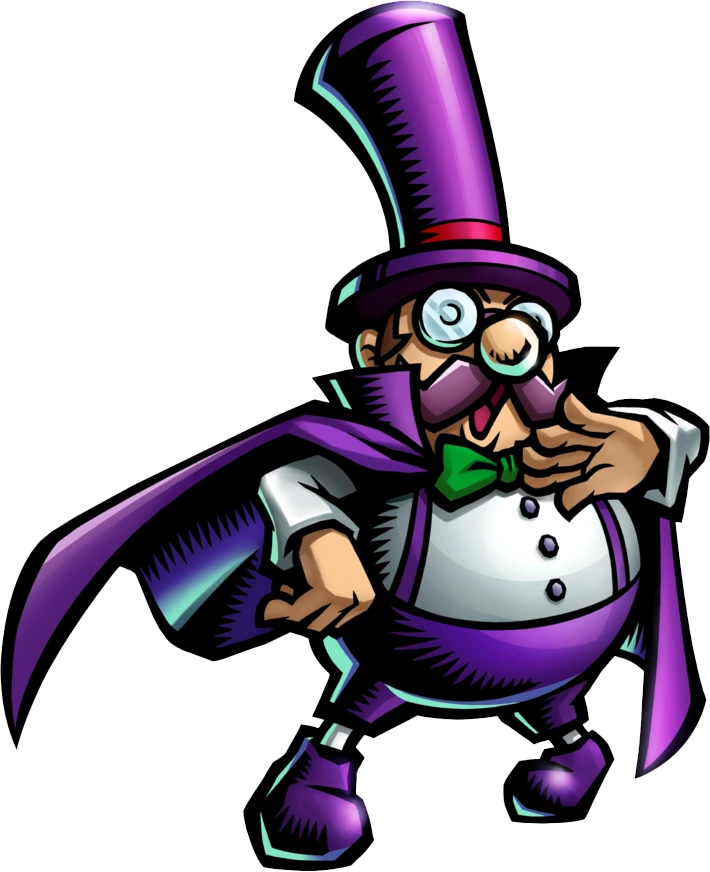 È un uomo panciuto vestito di viola, con il mantello e il lungo cilindro. Porta gli occhiali, un farfallino verde e i baffi viola, sebbene i capelli siano castani.