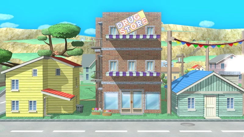 Lo scenario si svolge a Onett, nell'area a nord-ovest (stando al gioco originale) dove si trova il drogheria, il negozio dove Ness e i suoi amici possono comprare degli oggetti. Accanto, pero', ci sono due case, non presenti nel gioco principale, e un albero. La Drogheria ha due (anziché una) tende parasole sotto l'insegna, che cedono (con l'insegna) in base a quanti giocatori o oggetti ci sono sopra. Dalla strada possono arrivare anche delle macchine che possono investire i giocatori (cosa impossibile in quanto lo scontro si svolge comunque all'interno del marciapiede), ad avvisare il suo arrivo vi è un punto esclamativo rosso.