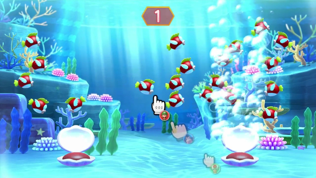 Il minigioco si svolge in un acquario del Regno dei Funghi, davanti ad una vasca con Pesci Smack e due Conchiglie all'interno. Al Via i rivali dovranno contare i Pesci Smack all'interno dell'acquario mentre il giocatore singolo deve intralciare gli avversari spaventando i Pesci Smack e aprendo le Conchiglie, per farlo il giocatore singolo deve puntare il suo cursore verso un Pesce Smack o una Conchiglia e premere A per selezionare. Allo scadere del tempo il minigioco avrà fine, subito dopo i rivali dovranno selezionare il numero esatto di Pesci Smack. Per farlo devono puntare il loro cursore verso le frecce in modo da regolare il contatore, poi devono premere A per confermare. Subito dopo verrà mostrato il numero esatto di Pesci Smack, se i rivali indovinano il numero esatto vincono loro, in caso contrario vince il giocatore singolo.
