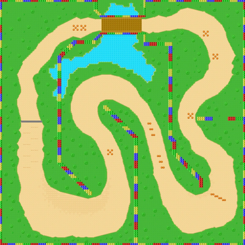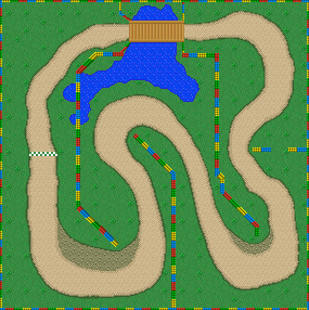Il circuito presenta un lago attravesato da un ponte. Nonostante la maggior parte del lago sia circondata da ostacoli, il giocatore può cadere in acqua. Oltre alle numerose curve, un grande ostacolo è una grande pozza di fango poco prima del traguardo, che rallenta i Kart che ci vanno sopra.