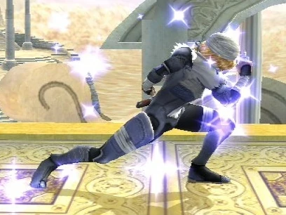 - | Granata accecante, la mossa speciale laterale di Sheik, consiste in una piccola granata che attira gli astanti ed esplode. Tieni premuto il pulsante per lanciarla più lontano. La mossa speciale in giù, Salto in spaccata, vede Sheik colpire con i talloni ricadendo. Se va a segno, Sheik salta di nuovo in aria. |