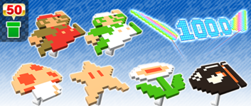 | Oggetti e strumenti | Strumenti normali | Banana • Bob-omba • Calamako • Cubo oggetto • Moneta • Moneta blu • Moneta rossa • Fulmine • Fungo scatto • Guscio rosso • Guscio spinoso • Guscio verde • Megafungo • Pallottolo Bill • Super clacson • Super stella |