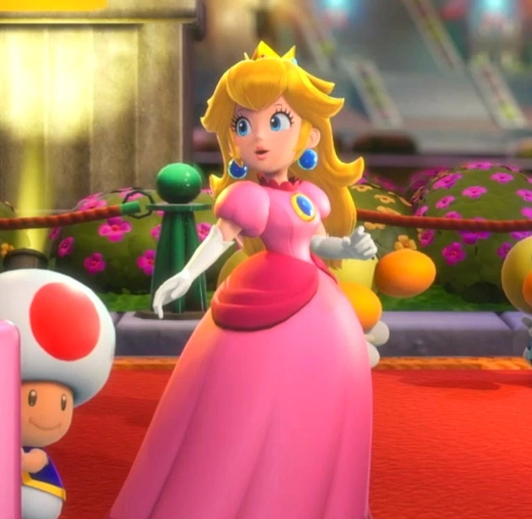 - オープニングでクッパにさらわれている。救出してからはピーチ城の向かって右で踊っており、タップすると跳ぶ。更に全色のキノピオを集め、キノピオの店を通して注文すれば、ケーキを焼いてお祝いしてくれる。彼女でクッパクラウンを撃墜すると「ガサゴソの森」に挑戦可能になる。