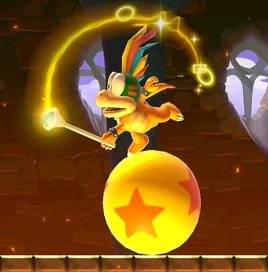 - オープニングで自身の顔がついた飛行船に乗り登場。ワールド1「ドングリへいげん」のボス。今回はボールではなく、踏むと点火する弾む爆弾を投げてくる。2回踏むと大きな爆弾を投げるようになる。