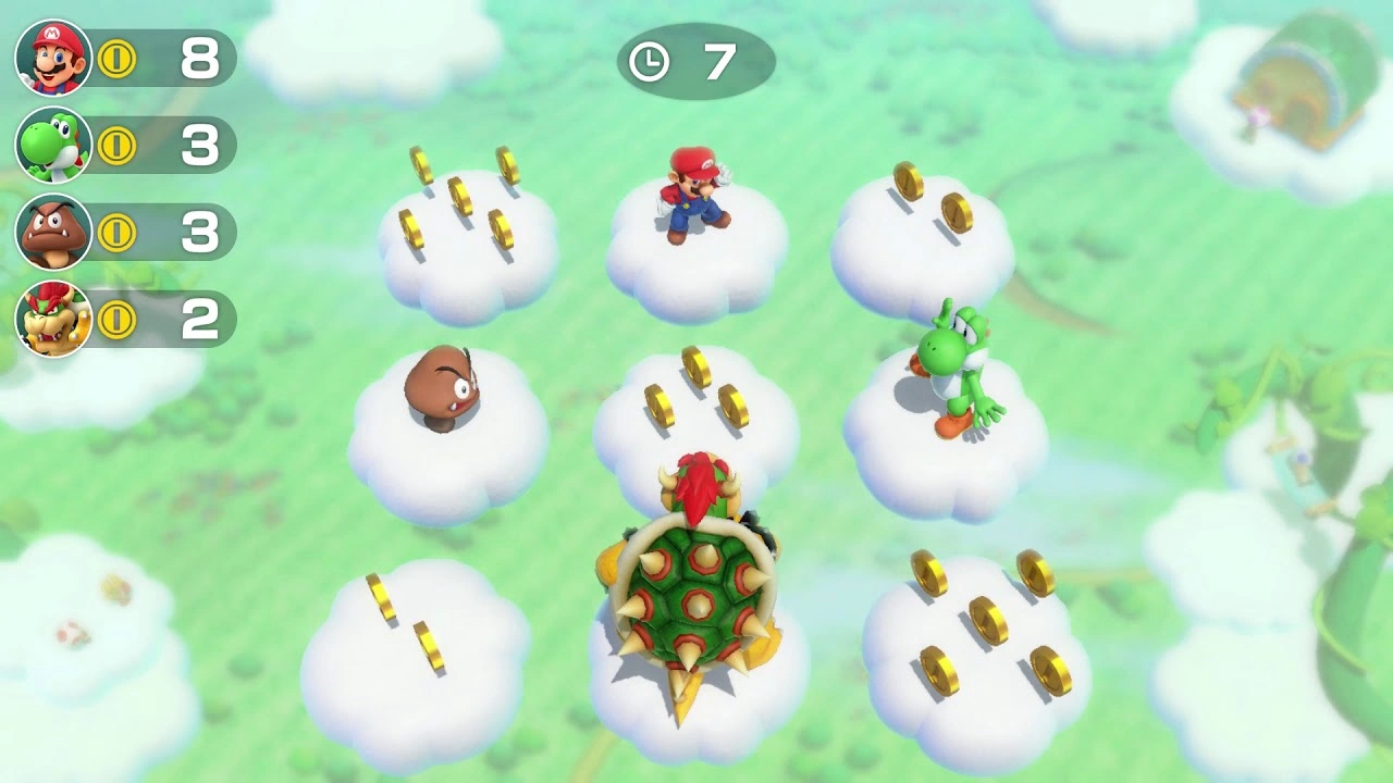 In this minigame, players can get coins in five rounds. After each round, there are more coins. The player chooses any cloud by pressing any button on the Joy-Con. After every player chose their cloud or time passed, The player earns coins if nobody else chooses the same cloud, unless they earn no coins when players chose the same cloud. The players chants if they get the coins, the players sulk for not getting coins. The players then return to their spots.