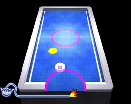 The microgame involves briefly playing air hockey, and the player has to defend their goal from the pucks. If the opponent scores, the player loses.