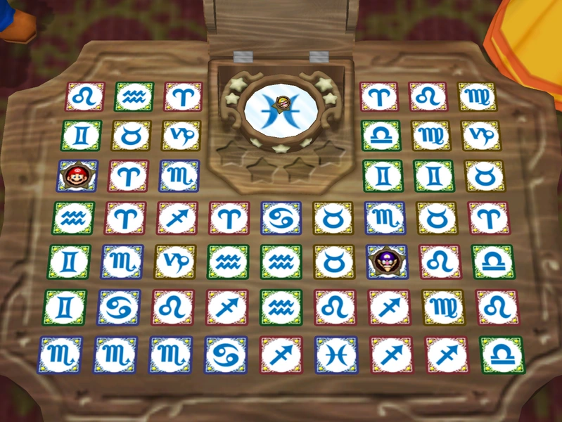 The objective is to find a symbol on the board that matches the card featured at the top. There is a container that contains many cards featuring astrological symbols. This container will open up, allowing all of the cards to fly out. Players must then take stamps and guide them around the board and find a matching astrological sign. The picture at the top will be distorted at the beginning, but will slowly become clearer as players progress.