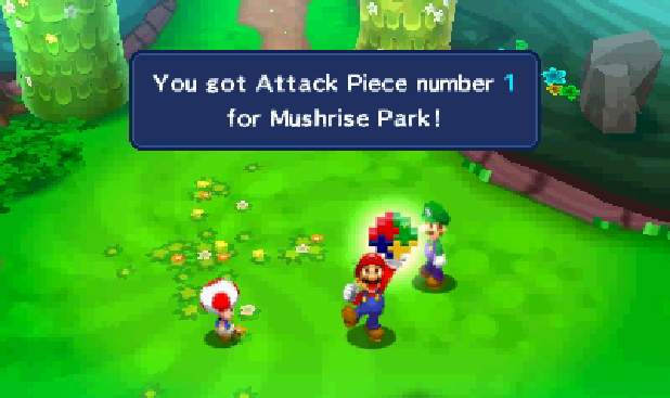 Attack Pieces return in Mario & Luigi: Dream Team where they can be scattered throughout places on Pi'illo Island and in the Dream World or given by certain characters. The theme for their obtainment has been changed, and now can play in other contexts. On the island, the player gets Bros. Attacks upon finding the Attack Pieces, and in the Dream World, finding them begets Luiginary Attacks. You must find all 10 in the respective location in order to get them.