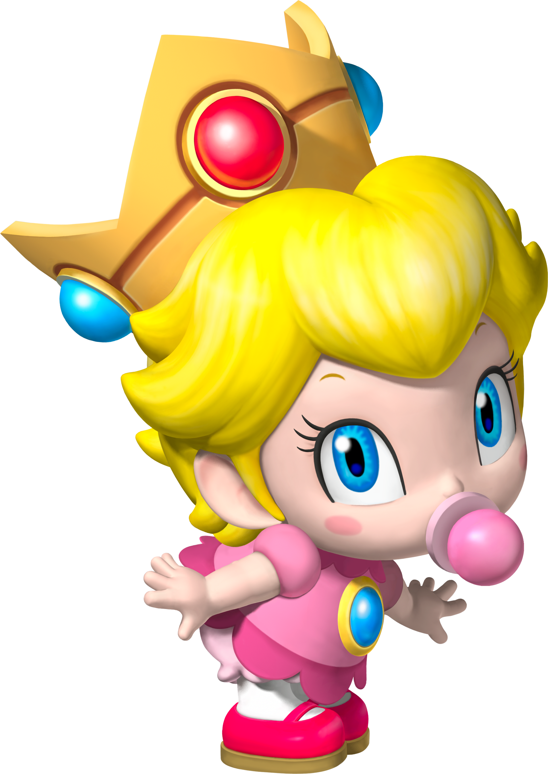 Baby Peach looks similar to Princess Peach, having her crown that slips to the side because of her small head. She has bright yellow hair and eyebrows. However, her build is tiny, much smaller than Peach's. She also has a dress similar to Peach's but having a frilly bottom that ends just above her bottom. In most games, she has a light pink ruffled diaper cover over white leggings and hot pink mary janes. Due to her high waisted dress and her mobility, her diaper is easily visible, and ends at the start of her thigh. In some installments, however, she wears a pink onesie over white leggings without her shoes. She also sucks on a bright pink binky. Her eyes are large and blue, and she has small pink blushes on her cheeks.