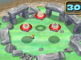 The three characters will work as a team to try and capture the lone player with their UFOs. The characters are situated in a set of ruins that are located near the shoreline. The team of three must capture the lone character by directing the UFO over the lone character.