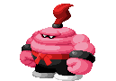 Beef appears as a blobby pink creature wearing black karate shorts, black wristbands, and a red karate belt. His red hair is tied back in a chonmage