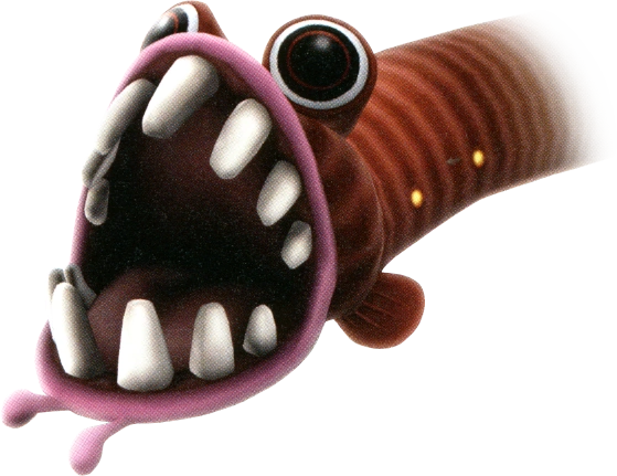As directly stated by their name, Big Gringills are giant variants of Gringills. Unlike their regular counterpart, Big Gringills are only found beating in caves, usually in the dark. Similar to the normal one, they are a darker brown in color with dark stripes in their bodies, and two feelers on their lower lips. They go slower and make a straining sound when they coming out in their holes and they give a 1-Up Mushroom when they are defeated.