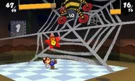 Mario fights the Big Scuttlebug right after leaving an area in Rustle Burrow. Unfortunately for him, he doesn't have Kersti at the time and must fight the Big Scuttlebug without the use of the Battle Spinner. The Big Scuttlebug mainly attacks by spinning webs at Mario and ramming into him. One noticeable thing in this fight is the giant web that the Big Scuttlebug is on. Mario must first destroy the web with distance Stickers like Fire Flowers (Mario also doesn't have his Hammer so Hammer-related Stickers are useless). If Mario jumps on the web, then the Scuttlebug will wrap him in a web and bite him dealing damage. After the web is destroyed, Mario can then finish off the Big Scuttlebug with strong Jump stickers.