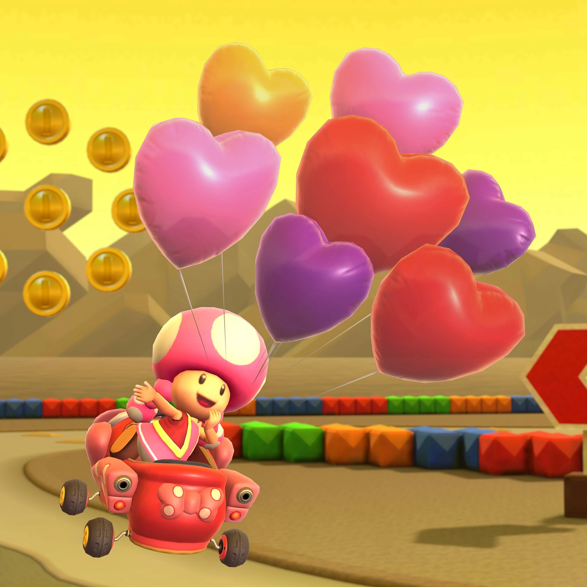 Toadette on the Birthday Girl, using the Heart Balloons whikst racing on Choco Island 2.