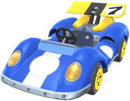 It resembles a 1960's prototype racecar, with a "7" printed on the gold-yellow spoiler. Its design is near-identical to Luigi's Streamliner and the Jetsetter from Mario Kart DS and Mario Kart Wii respectively. It also shares similarities to the Mach 8 in Mario Kart 8 and Mario Kart 8 Deluxe.