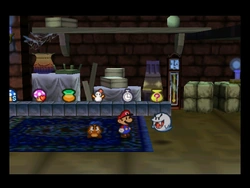 It is an Item Shop run by a Boo named Igor in the basement of Boo's Mansion . This shop is known for selling Life Shrooms and other expensive, but rare items such as the Stop Watch . It is also the only shop to sell the Mystery item. During the first arrival at Boo's Shop, Igor will not sell any items to Mario by orders of Lady Bow . However, once Lady Bow joins Mario's party, Igor allows him to purchase items at any time. Visiting this shop may also be required in order to complete one of Koopa Koot 's favors that requires the player to bring a Life Shroom to him.