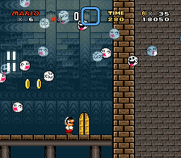 Fire Mario looking up at a Boo Buddy Swarm in Super Mario World