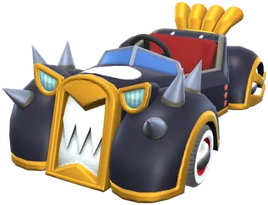 The Bruiser has a black body. There are spikes on the front sides. On the front center of the kart is a monster-looking face, with the eyes serving as headlights. There are four, light yellow-gold exhaust pipes. The character's emblem is located on the hood.