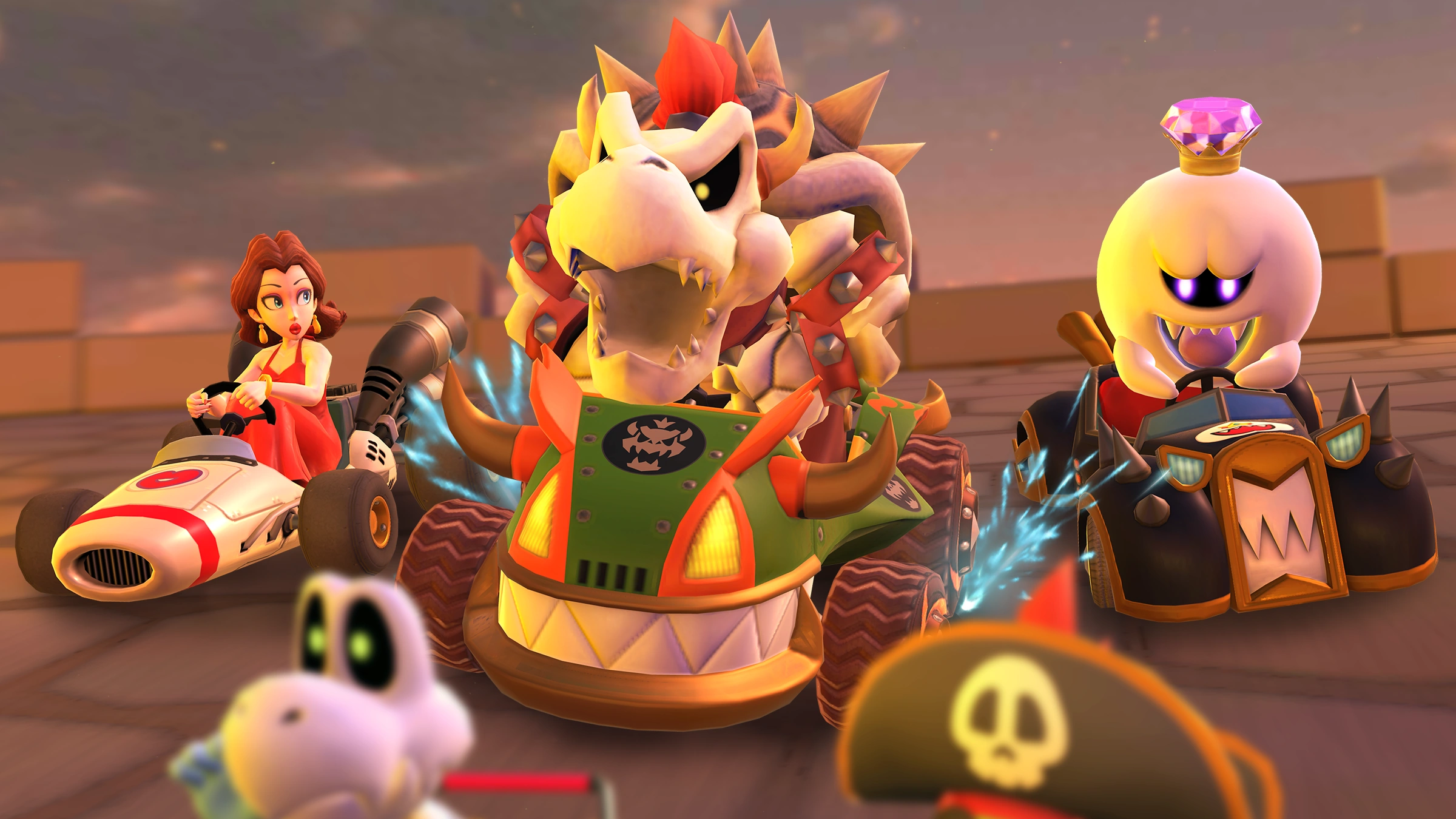 King Boo (Luigi's Mansion) driving the Bruiser, racing with Dry Bowser, Pauline, Dry Bones and Bowser Jr. (Pirate) during the Pirate Tour.
