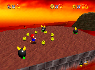 Mario (or either Yoshi, Luigi, or Wario in Super Mario 64 DS) has to defeat three Bullies on a large platform at the back right. To reach there, Mario has to take the left path at the first split, followed by the right path at the next split, and then use the various platforms in order to reach the three Bullies. While battling the Bullies, all three may sometimes charge at Mario at the same time. The platform also has coins arranged in a circle formation, and collecting a few can provide benefit in case Mario has taken damage from falling into the lava.
