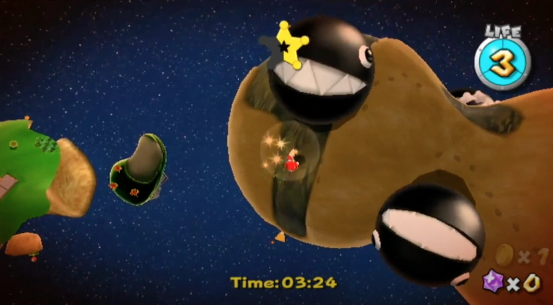 Chomps appear in Super Mario Galaxy, in this game, they typically can be found in several Galaxies rolling around various planets. They are either spawned from holes/portals or are seen rolling by default. Chomps will damage Mario/Luigi upon contact and can typically only be avoided (unless the plumbers are under the effects of a Rainbow Star) thereby making them far tougher than the Boulders. A Chomp can also be beaten by causing another Chomp to collide with it via the P2 Star Cursor. A Chomp provides 10 Star Bits upon defeat. Chomps can be found in Galaxies such as the Good Egg Galaxy, and the Ghostly Galaxy. Two variants of Chomps also appear in this game these being Chomp Pups (which are smaller and emerge from kennels), and Golden Chomps (which hold Power Stars).